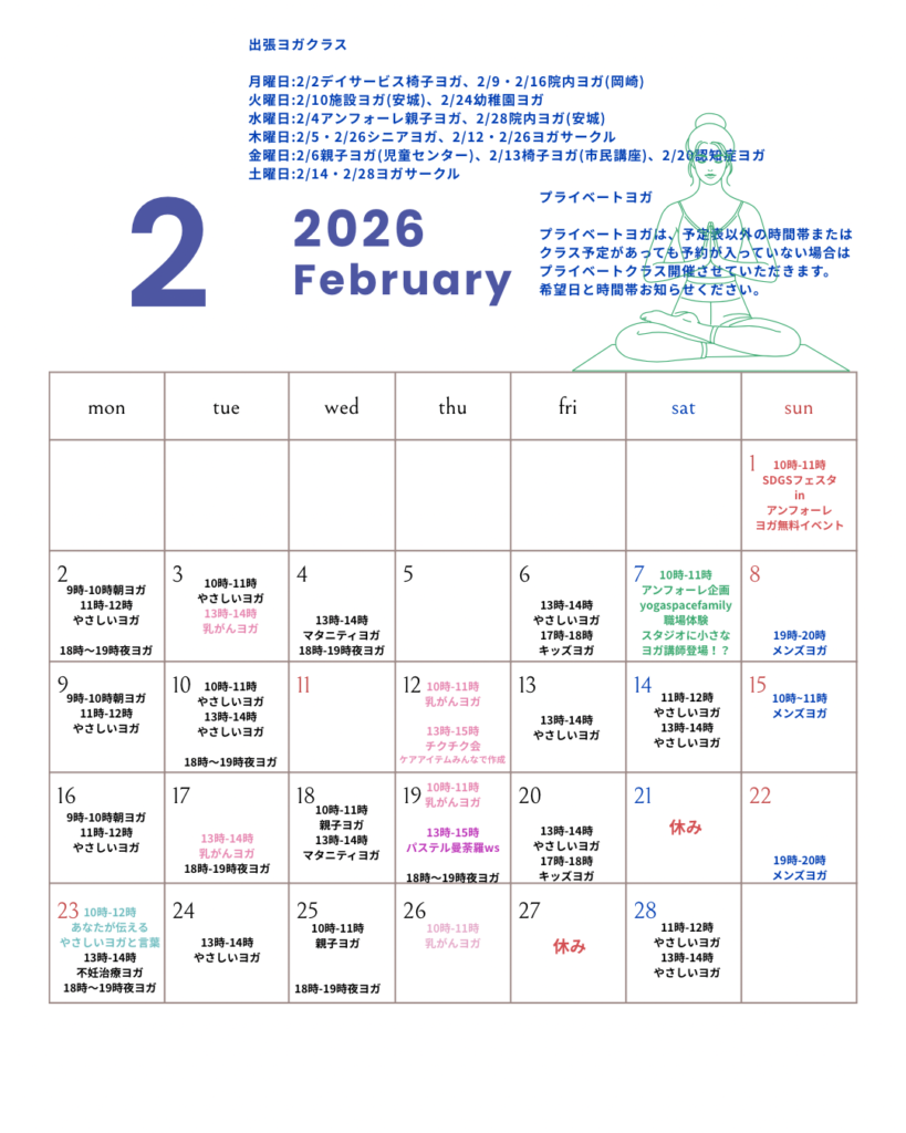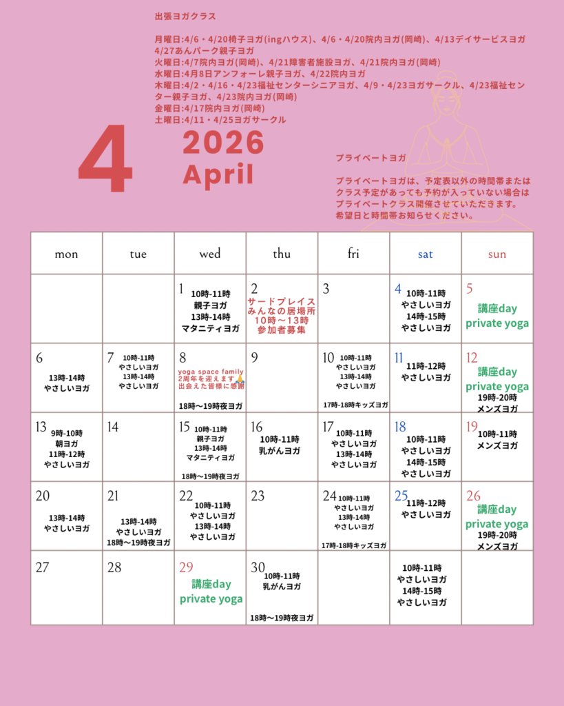 2月・3月・4月スタジオ予定表 2026年4月6日 最終更新日時 : 2026年4月6日 yoga-space-family 4月8日で2周年を迎えます🙏これからも思い変わらず心地いい時間過ごせるように日々丁寧にヨガをお伝えします。 皆さんのお越しをお待ちしております。 yoga space family 須田恵利華
